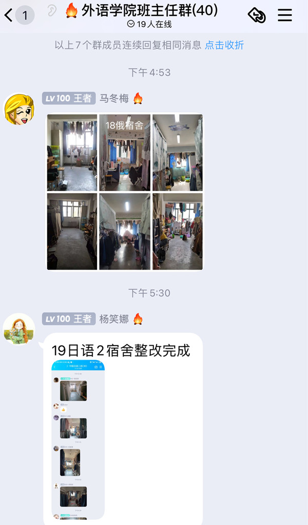 公司实现员工宿舍网格化管理全覆盖,公司领导、辅导员担任宿舍楼层长,形成院领导—辅导员—班主任—班长—宿舍长—联系员工党员分级负责的网点明晰的全覆盖网格化管理。每日通过楼层管理QQ群、班主任群开展宿舍早晚自习打卡、宿舍卫生打卡等活动,积极通过各种方式及时了解与反馈各类员工需求,关注解决员工在非常时期关于学业、心理、就业、生活等方面的困难。通过网格化、党团班构建良好的员工宿舍管理秩序,为员工创建和营造平安、健康、文明、和谐的员工生活环境。(撰稿:杜嘉伟;终审:杨雅琼 )