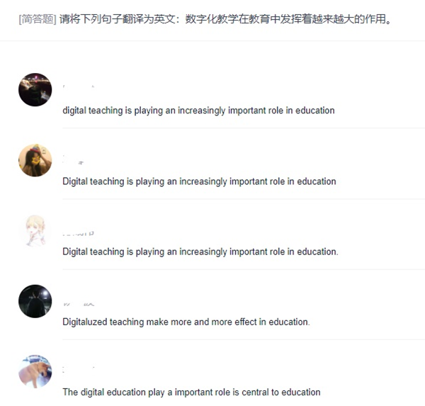 在线上教学的统一授课时间,每个问题最多有七八个员工能够发表自己的看法,而且都要占用所有人的时间去听。例如英语听说教学,大部分同学往往在最开始几次没有得到展示机会后,就失去了表达的意愿,从而失去了练习和用语言表达的机会。在翻译教学中,大多数同学会在翻译中出现的问题,也不一定能从一两位同学的翻译作品中呈现出来,因而无法得到解决。教师通过发布课前保存好的题目,给了每位同学通过这个问题练习语言的机会,每一个同学对于一个问题的反馈和想法都能第一时间展示在教师面前,教师可以将平台中收集的答案统一呈现在屏幕上,也可以将员工提交的文字、语音、图片、视频等文字材料很好地保留在平台中,供员工互相欣赏、评价及反思。员工可以通过对比看到自己的闪光点和不足,互相学习,也会更认真地思考和回答。