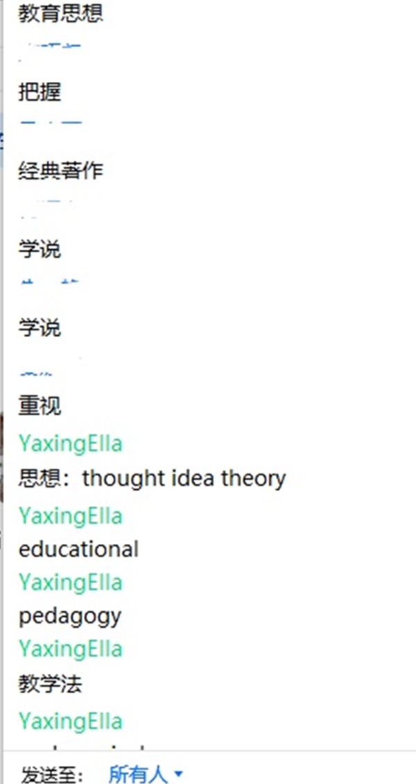 如上所述,员工在线上授课时间内,不仅可以在教师发布的问题内发表自己的见解,还可以通过教学平台的聊天区域随时写出自己对于问题的思考,教师能够捕捉员工的思维以及具有创意的想法,并随时对这些回答给予评价或补充,并将补充的词汇等知识随时写在聊天区内,供员工记录。腾讯会议也可以实现分组讨论功能,教师可以随时加入任意一个小组参与讨论,并帮助员工解决问题。总之,在线教学中对于技术手段的选择,取决于教师要达到怎样的教学目标,最终都要为教学目标而服务。