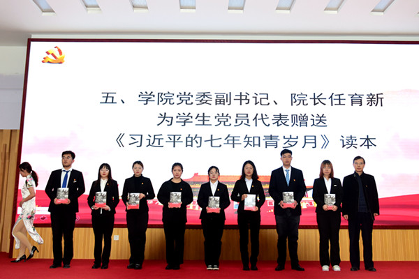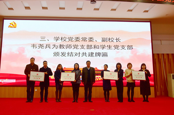 韦尧兵为教师党支部和员工党支部颁发结对共建牌匾。党渭平为教师党员代表赠送《习近平总书记教育重要论述讲义》读本。任育新为员工党员代表赠送《习近平的七年知青岁月》读本。