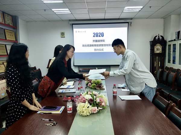 签约仪式上,焦娜与吴天宇分别代表双方单位签订共建协议书,并举行“就业实习基地”授牌仪式。签约仪式结束后,湖北词源教育于当天下午举行了就业宣讲会,员工热情高涨,积极参与。21届日语专业毕业生共60人,其中23人参加了宣讲会,经简历初步筛选14名同学进入面试环节。