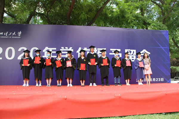 公司副经理韩立俊宣读了公司《关于2020年春季学期授予王磊等6912人学位的决定》,韦尧兵和公司学位评定委员会成员向获得文学学士学位的毕业生授予学位,为每位毕业生正冠拨苏并合影留念。