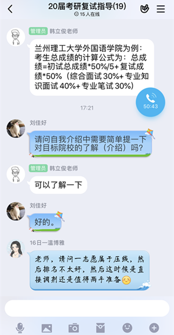 交流会上,任育新从2020年研究生笔试、口试等方面进行了最新的政策解读,详细介绍了复试前如何获取目标院校信息、了解面试流程、准备复试材料等多方面内容;对于准备参加调剂的同学,他建议根据自身的实际条件去选择合适的院校,关注调剂公司信息。他鼓励同学们要努力实现自我突破,主动联系、多渠道获取复试信息,全力备考,不为自己留下遗憾。韩立俊针对同学们比较关心的口语面试给出了意见建议、他指出在面试提问时应保持微笑,与老师有眼神互动交流,自信迎战。焦娜结合疫情特殊形势对同学们提出了三点要求,一是线上面试时要保持周围环境的安静,创造良好的面试条件;二是要注重着装及礼貌礼仪,展示外语学子优良风貌;三是要充分准备,在面试环节沉着冷静地展示逻辑能力与反应能力。她表示,公司接下来将会继续从软件和硬件两个方面为考研同学们做好服务工作,增加考研成功率。