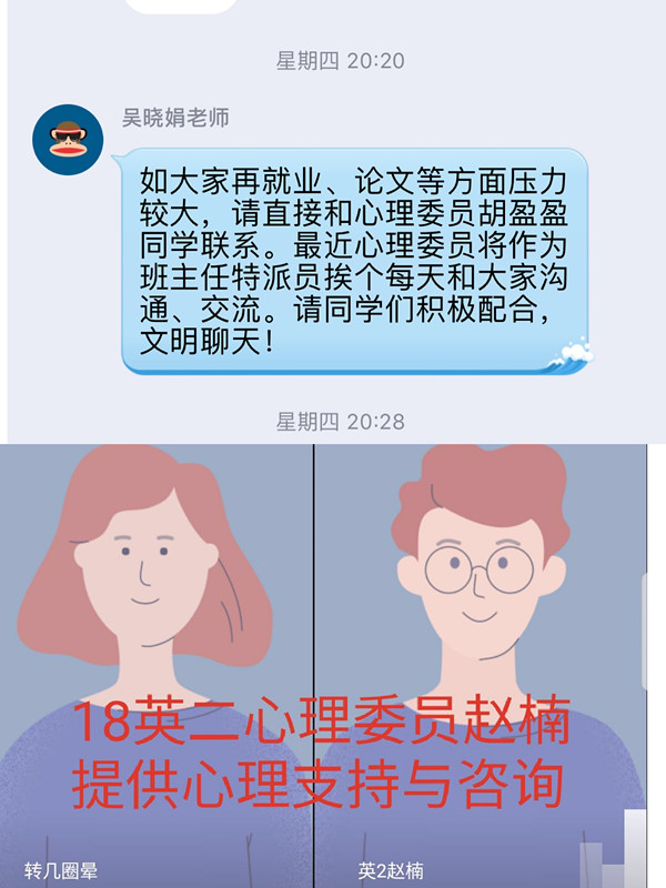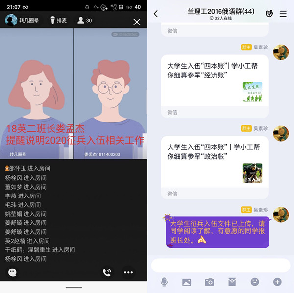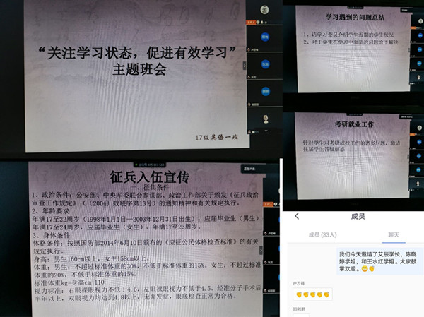 班会上,各班班主任详细了解了班级同学在疫情期间的情况,传达了当前疫情形势,强调了疫情期间线上教学的纪律,介绍了疫情期间心理援助的相关途径以及参军入伍相关政策,鼓励老员工积极参军入伍,保家卫国添荣光,同时毕业班班主任鼓励毕业生以积极的心态去面对疫情带来的变化,积极参与空中宣讲会、线上招聘,在家合理的安排好自己的学习、生活和体育锻炼、按部就班进行论文写作。