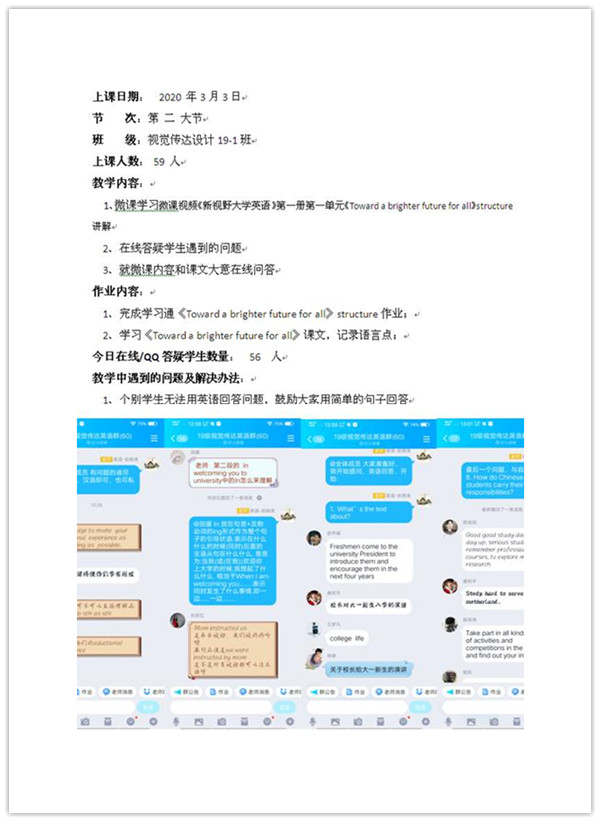 设计线上教学日志,创新教学管理。全新的线上教学,对课堂教学环节的督导同样带来困难与挑战。公司大学外语第一教学部的老师们集思广益,群策群议,设计了针对线上教学的“线上教学日志模板”,及时跟踪和小结每次课堂的实际情况,针对每一课可能出现的问题及时做出调整。该线上教学日志一经发布,全院效仿,为线上教学保质保量开展提供了有力的保障手段。
