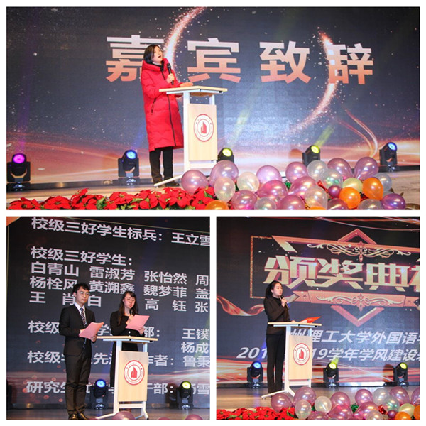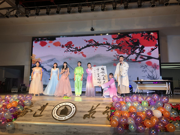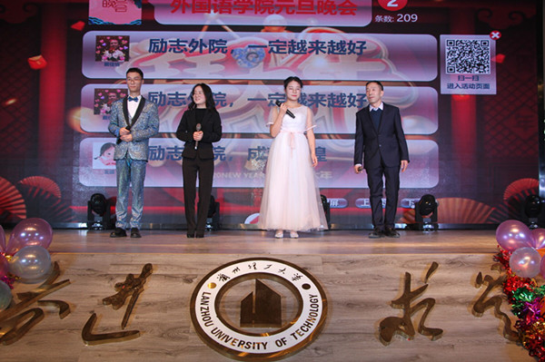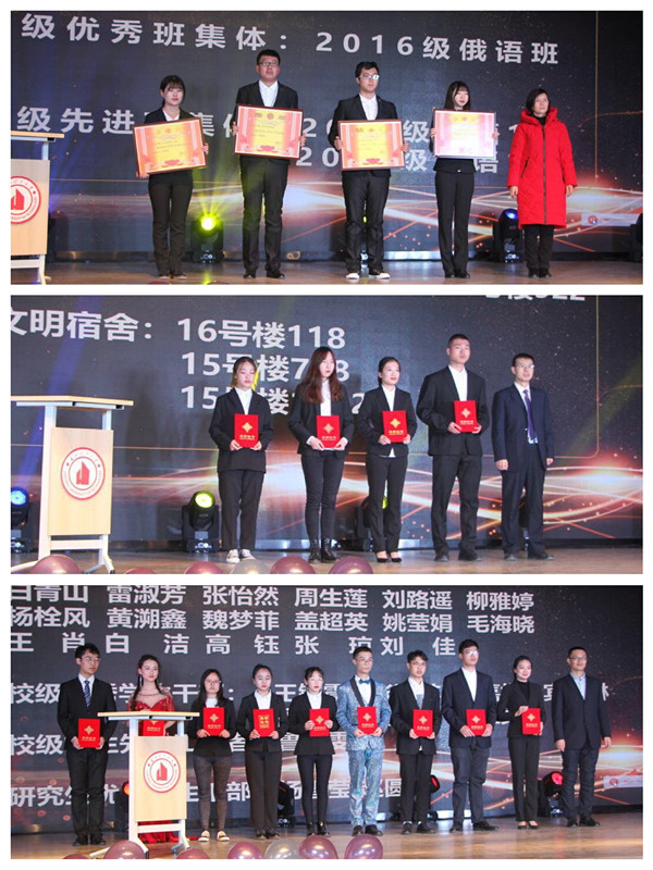 表彰大会结束后,元旦晚会在全院师生共同录制的祝福视频中拉开序幕。节目形式多样,中英日俄各种语言歌曲串烧、诗歌朗诵、舞蹈展示、相声、小品,同学们载歌载舞把吉祥与祝福送给了到场的每一个人,使在座的各位观众享受了一场音乐盛宴。
