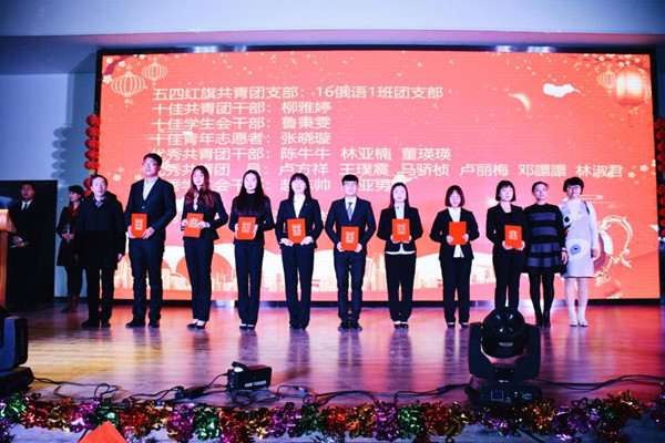 晚会在全院师生共同录制的祝福视频中拉开序幕,节目形式多样,中英日俄各种语言歌曲串烧、诗歌朗诵、舞蹈展示、相声、小品,使在座的各位观众享受了一场音乐盛宴;由公司领导带来的《祖国啊祖国,我亲爱的祖国》鼓舞人心,撩人心弦;艺术团和各年级员工代表带来时尚绚丽的各种舞蹈,有力的动作舞出蓬勃的活力,默契的配合秀出青春的风采;相声《兰理工吐槽大会》以风趣幽默的动作、诙谐调侃的语言令在场观众捧腹;晚会在一首青春歌曲串烧《追梦,在路上》中圆满谢幕。演出结束后,各位领导老师与演职人员合影留念。此外,本场晚会共有两轮易班抽奖活动,台上台下的互动也一次次将晚会推向高潮。