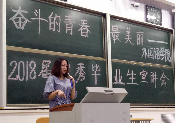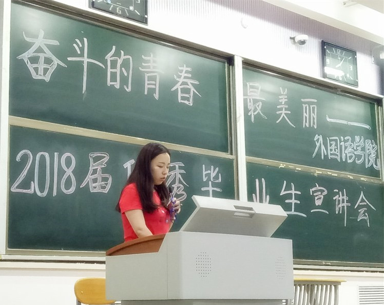 宣讲会开始,外国语公司团委书记贾永胜老师为大会致辞,并与大家分享就业方面的经验,他也希望通过优秀毕业生的经验分享为同学们提供参照,引导公司员工坚定理想信念,勇于担当作为,向成才榜样看齐,为今后的考研之路、求职之路或者出国留学之路提供良好示范。