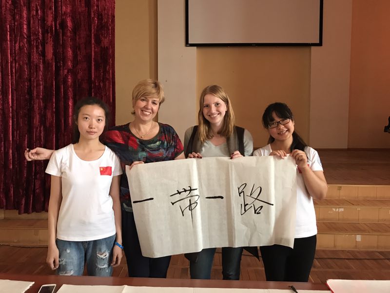 伴着幽静舒缓的古琴乐曲,团队成员身着汉服现场讲授品茶、冲泡方法以及茶具品鉴等茶知识,演示摆具、赏茶、温杯洁具、投茶、洗茶、泡茶、分茶、敬茶品茗等整个茶艺过程,在国立水文大学师生对中华茶文化有了初步了解后邀请其进行不同种类茶叶的冲泡品尝,体验领略中国茶文化的博大精深。一位参与体验的老师说:“我以前只听说过中国茶道,今天第一次亲眼目睹、亲手尝试,真的很有意思,我很喜欢!”一位冲泡品尝了大红袍的员工羞涩地说道:“茶叶真的很香,很好闻,喝到嘴里有点苦涩,很奇特的味觉感受。”随后,两位同学一展书法技能,方案之间、挥斥方遒,通过介绍中国书法“文房四宝”并讲解、演示如何执笔、运笔等使现场师生懂得了基本姿势以及书写要领,在观看两位同学现场书写时,俄罗斯国立水文大学师生神情专注,表现出极大兴趣,个个跃跃欲试,体验环节争相上台,一边揣摩、一边细致地书写着每个笔画,在两位同学的悉心指导下,成功完成了“中俄友好”、“一带一路”等作品,其中书写“一带一路”的老师在活动结束后专门留下与我们沟通,希望能够把“一带一路”这幅字留给她,她要好好珍藏,令团队成员非常感动。