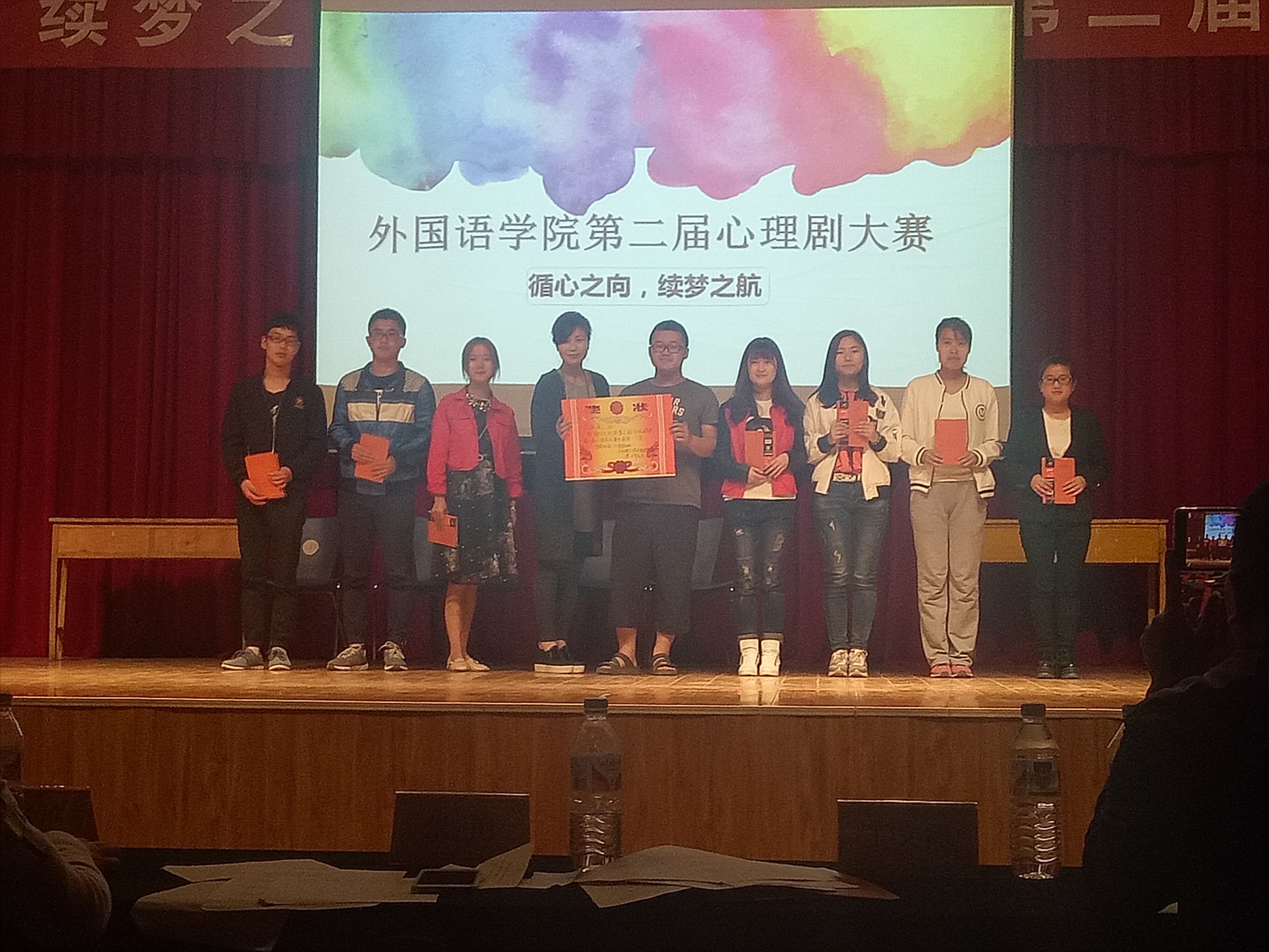本届心理剧大赛自4月上旬在全院范围内展开,各班级认真准备,积极参与,经过初赛的严格筛选,共有9支队伍进入决赛。参赛心理剧是各班级员工立足于校园生活自编自导自演的剧目,以声情并茂、生动感人的表演,较为真实地反映了当前老员工学习和生活中多领域的情景,展现了当代老员工感恩、责任、自信、互助、进取的良好精神风貌,演出使观众产生了强烈的心理共鸣,帮助同学们更好地直面身边的问题,用更积极的心态和方式方法来解决学习和生活中遇到的问题。15级日语二班的《心门》和16级日语二班《孤独的守望者》体现了爱情与友情交织的时候,我们该如何更好的做出抉择,更好的享受爱情与友情的双丰收。16级英语一班《谁的青春不留白》则展现了现代校园里老员工们对于爱情追寻的心理路程。15级俄语班《少女情与中国心》和15级日语一班的《匿名说说》以及心委会的《来自远方的告诫》则结合了当下的热点话题,提醒同学们应该如何正确面对网络以及新事物,如何正确的做出选择,如何理性爱国,如何理性消费。15级英语一班《一个创可贴的故事》和16级日语一班《接纳自己》反映了该如何处理好室友关系,和室友友好相处。16级俄语班《你的大学四年不是一场梦》则通过一场贯穿大学四年的梦告诉了我们要好好利用大学四年时间,不虚度青春。9部心理剧涵盖了老员工现实心理的酸甜苦辣,体现出“90后”一代对心理健康的主动追求,引起了全场师生的深刻共鸣。最后15级英语一班靠精湛的演技以及完美的剧情获得本次大赛一等奖。期间的“吃瓜”小游戏以及心委会带来的手语操《勇往直前》也为本次比赛带来了两个高潮。