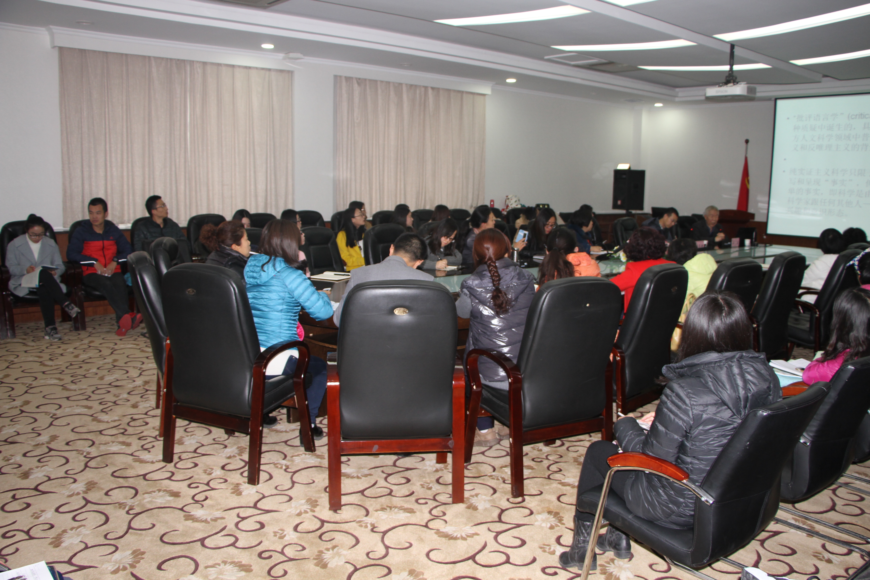 辛斌教授向与会的师生详细介绍了批评话语分析的学科历史、意义、研究方法、面临的问题及学科发展的走向。辛教授旁征博引,以批评话语分析的视角对国内外部分热点事件进行了全方位的解读。