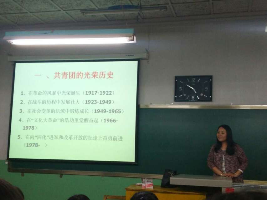 首先毛老师就“什么是青马工程”、“为什么要开展青马工程”以及“团学干部应具备何种素质”等方面,勉励学员通过培训锻炼提高个人综合能力。激励广老员工干部认真学习马克思主义理论,积极践行社会主义核心价值观,鼓励同学们认真聆听,有所收获。随后,毛老师做题为《纪念五四运动 继承发扬优秀传统》专题讲座,为同学们讲解了中国的十四年抗战及其意义、五四精神及中国梦,她希望广大团员青年和全体员工干部追随党的号召,能够牢记国耻、发奋图强、锐意进取,勤奋学习,继承发扬优秀传统,成长为一名合格的老员工,为祖国发展建设做出贡献。