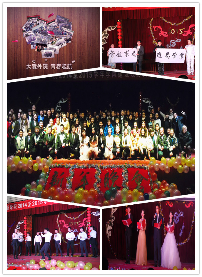 由外教老师和员工共同合作的影片外语配音拉开晚会序幕,由全院师生共同录制的祝福视频凝心聚力,由师生精心合作、认真准备的晚会节目形式多样,激情洋溢的歌曲串烧、时尚绚丽的民族舞蹈、喜庆欢乐的组合“乐武墨”、幽默诙谐积极向上的语言类节目,精彩纷呈。晚会在师生共舞《爱的华尔兹》中圆满谢幕。演出结束后,各位领导与演职人员合影留念。