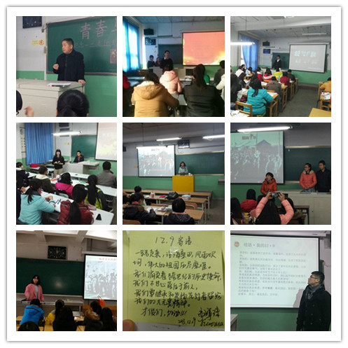 2014级英语2班全体师生一起回顾了那段在中国共产党引领下举行的声势浩大的抗日救国示威游行,使员工深入了解历史真相,通过校团委王正民书记的主题报告和热烈的“共筑中国梦”之讨论,引发员工集体爱国情感;2015级俄语团支部,采取“一二九运动”知识竞赛、“我的中国心”寄语等方式,展示当代老员工的精神风貌和爱国情怀;2013级日语2班,同学们以激情澎湃的爱国主题演讲、激发爱国热情,活动现场同学们积极利用网络平台表达对爱国先烈的热爱之情;2013级英语2班由团支书带领大家重温历史,通过爱国歌曲联唱,使同学们更深刻地体会到先辈们身上那种大无畏的爱国精神;2013级日语2班开展“铭记一二九,共筑中国梦”主题演讲活动,同学们纷纷表示作为祖国的未来,要为祖国的繁荣昌盛而认真学习,风雨同舟,患难与共,愿祖国更加富强;2014级日语2班展示了“一二.九”运动时留下的珍贵图片,使同学们体会到了“复兴和发展中华民族”的使命,增加了努力学习的动力,更让大家明确了自己的报国之志;2014级日语1班由主持人为大家讲解了“一二•九”抗日救亡运动的情景,并进行了《青春的传说》诗歌朗诵,同学们激情澎湃,活动气氛十分活跃;2012级英语2班观看电影《百年情书》,让大家了解了当时老员工挥斥方遒的革命勇气,为国家将个人生死置之度外的大无畏精神,观影后,同学们都纷纷表达了对当时先烈的敬佩,一位同学讲到“其实大家都是一样的,我们每个人都与祖国息息相关,大家纷纷表示作为毕业生要承担起当代老员工的责任,为祖国的发展建设贡献自己的一份力量……