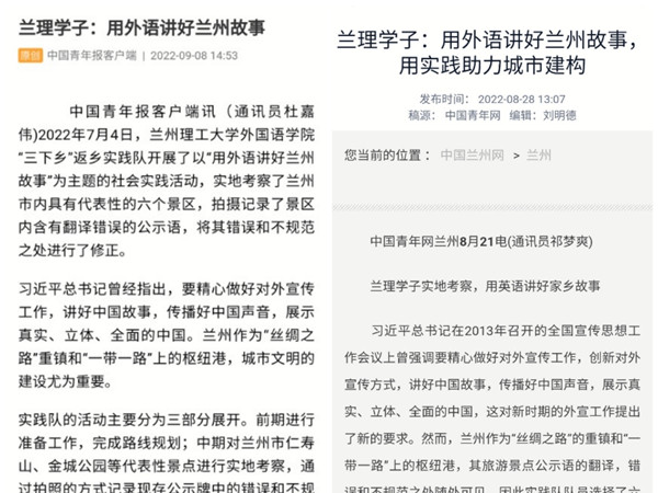 通过此次社会实践活动,进一步坚定了外院学子听党话、跟党走的思想自觉和行动自觉,明确了当代青年所肩负的历史使命,为更好的服务社会打下了坚定的基础。其中“用外语讲好兰州故事——兰州市旅游景区公示语英译”团队受到了中国青年报、中国兰州网等多家媒体报道,得到了社会各界的广泛好评。