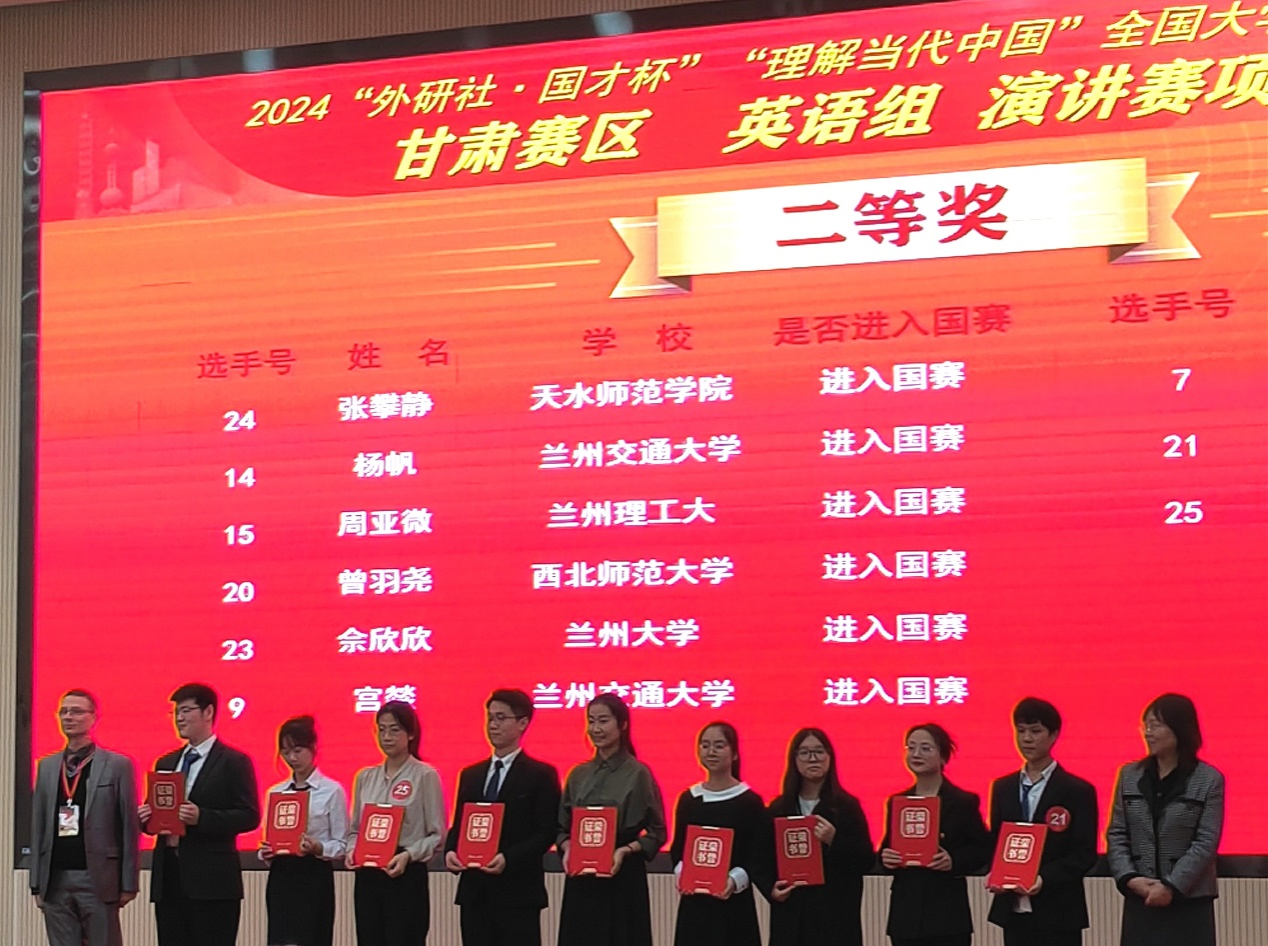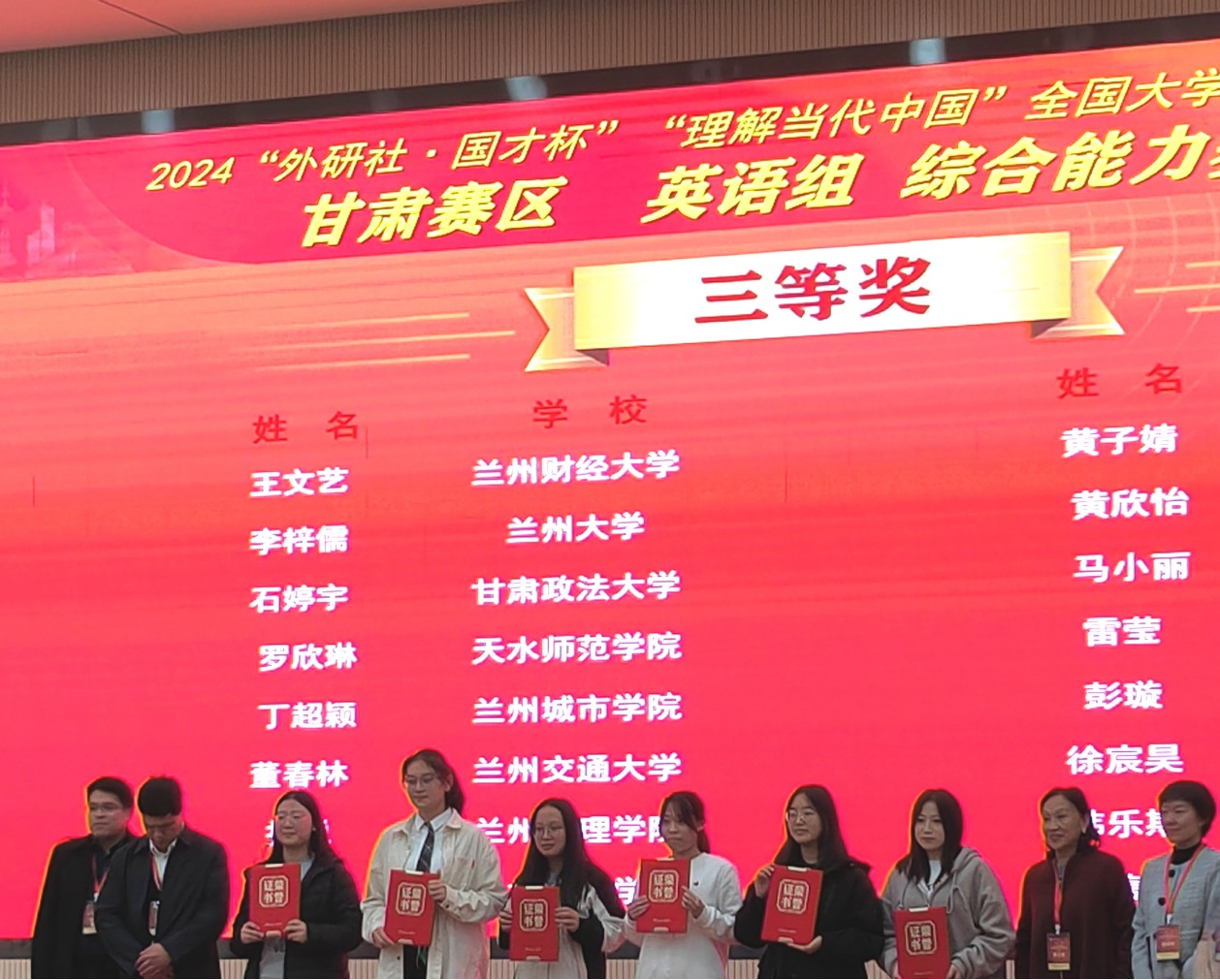 本次比赛由甘肃省教育厅主办,兰州财经大学、甘肃省大学外语教学研究会、外语教学与研究出版社承办。来自省内二十多所高校的三百多名选手参加英语演讲、口译、笔译、综合能力和短视频等赛项的角逐,竞争异常激烈。最终演讲组周亚微、白秋雨获得二等奖,唐毅铖获得三等奖,其中周亚微晋级国赛;笔译组李冰冰、张芬分获二等奖和三等奖;口译组吕思逸、综合能力组黄欣怡、短视频组“扶我青云志”队均获得三等奖。