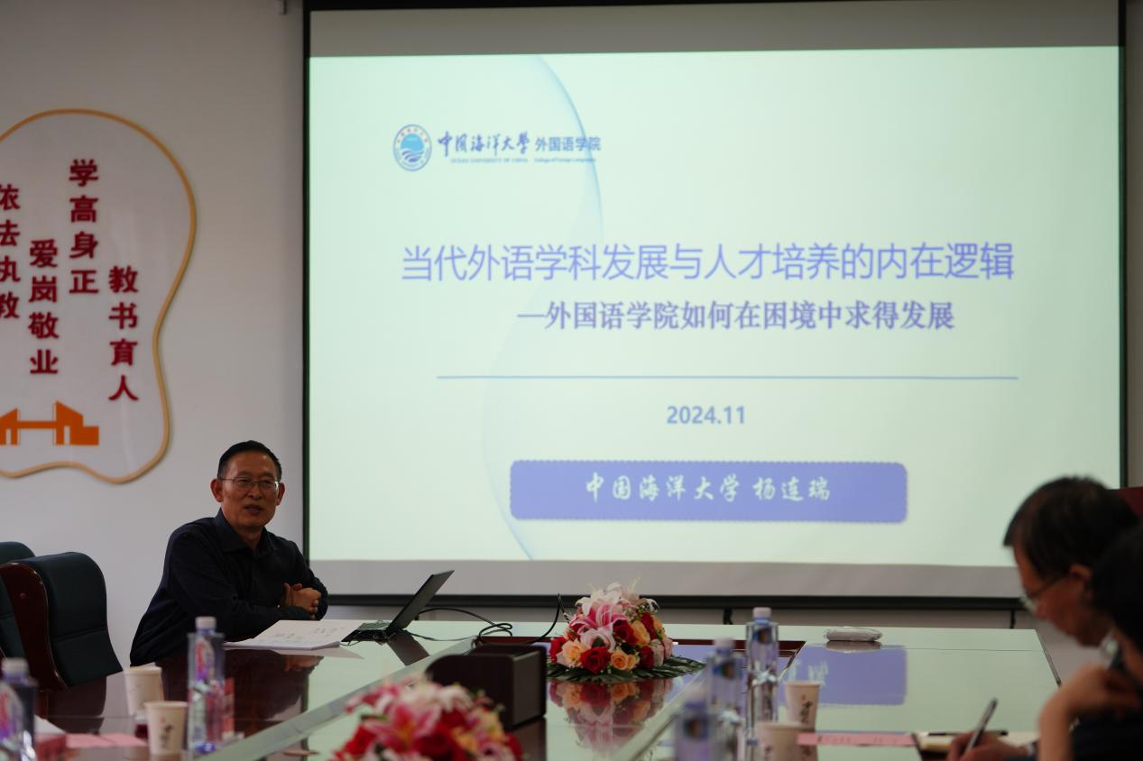 任育新就公司学科发展和专业建设情况进行了汇报。之后,杨连瑞教授作了“外语学科发展与人才培养的内在逻辑”为题的讲座。通过具体介绍牵头获得的2022年国家教学成果二等奖《基于价值引领的外语学科“五协同”育人模式创新与实践》,对学科与国家战略、团队与国际名师、课题与优质课程、过程与培养质量、成果与社会需求互相协同的人才培养模式进行了交流。杨连瑞教授强调,外语学科需要对接国家战略和社会需求,注重内部挖潜和平台建设,践行外语学科思想性、工具性、人文性和科学性,积极探索解决本学科的发展困境。
